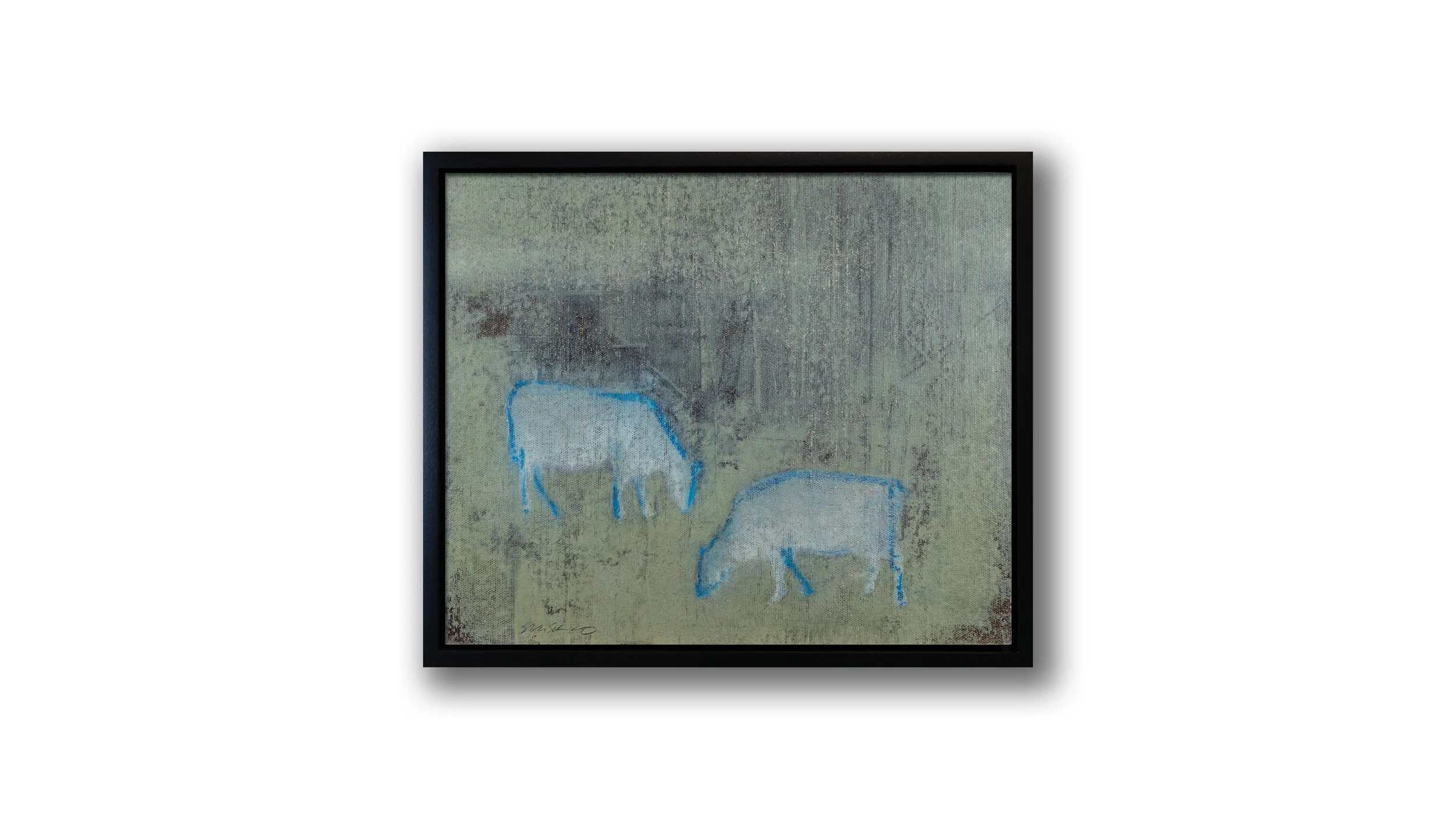 Through a combination of oil stick drawing, monotype printing, and brushwork, I sought to create images that feel both immediate and enduring—primitive in their directness yet refined in their construction. The cows, rendered in varied palettes of blue, black, white, and coral pink, stand within abstracted landscapes that evoke stillness, companionship, and the rhythm of the natural world.