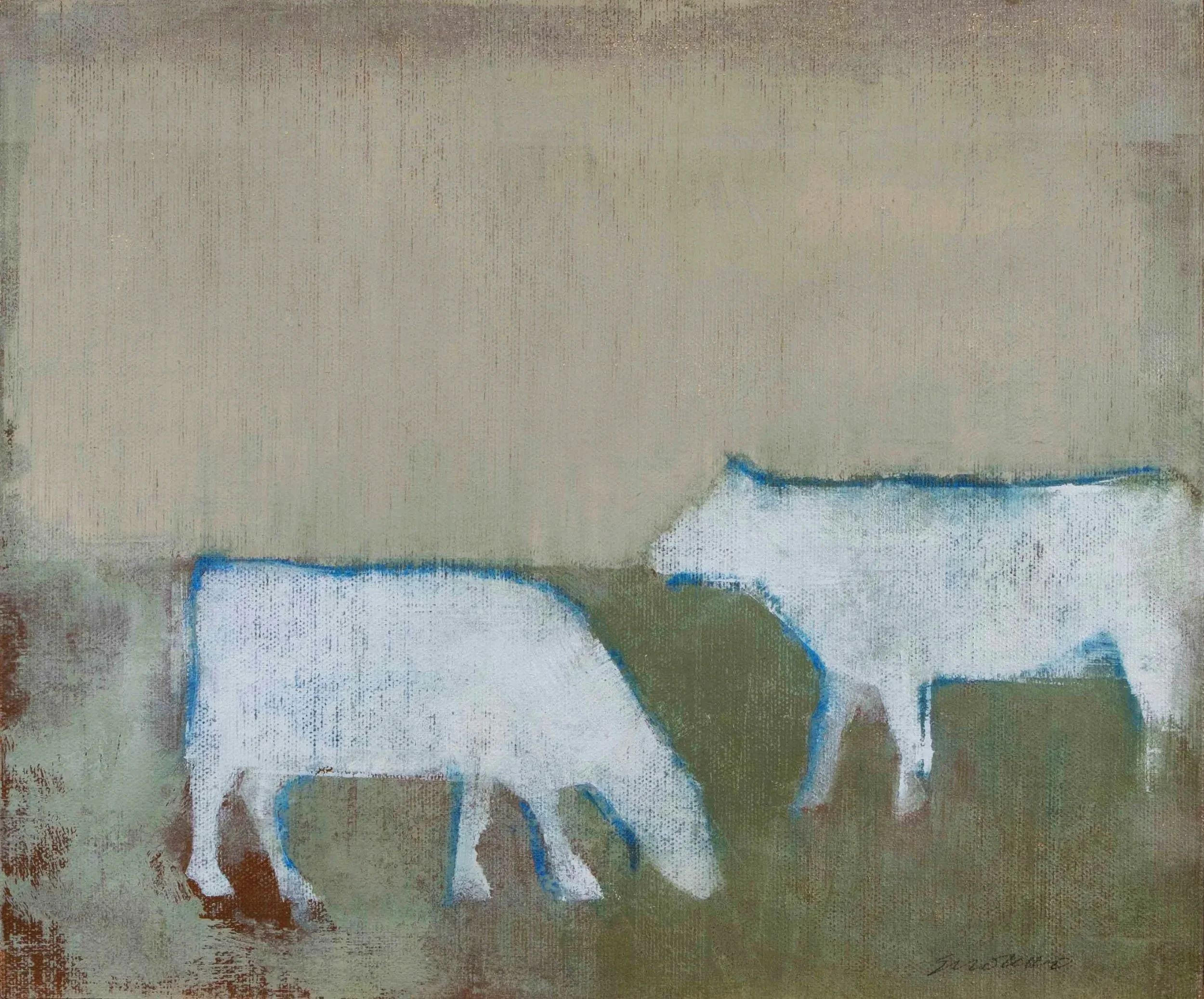 The Cow Paintings emerged from that observation—not from life sketches, but from an idea, from memory, imagination, and creative process. I wasn’t interested in depicting a particular animal or breed, but rather in exploring their presence as form and symbol. In painting them, I found myself drawn to reduction—to simplicity of gesture, to balance, to what remains when everything unnecessary has been set aside.